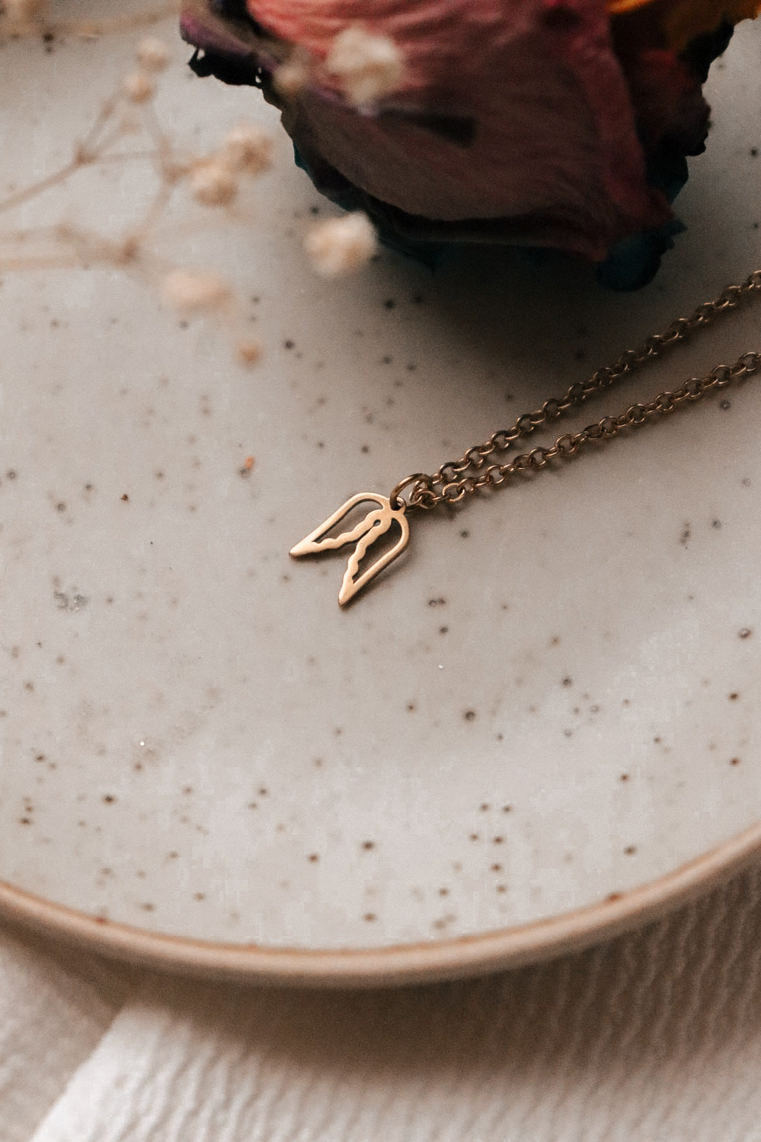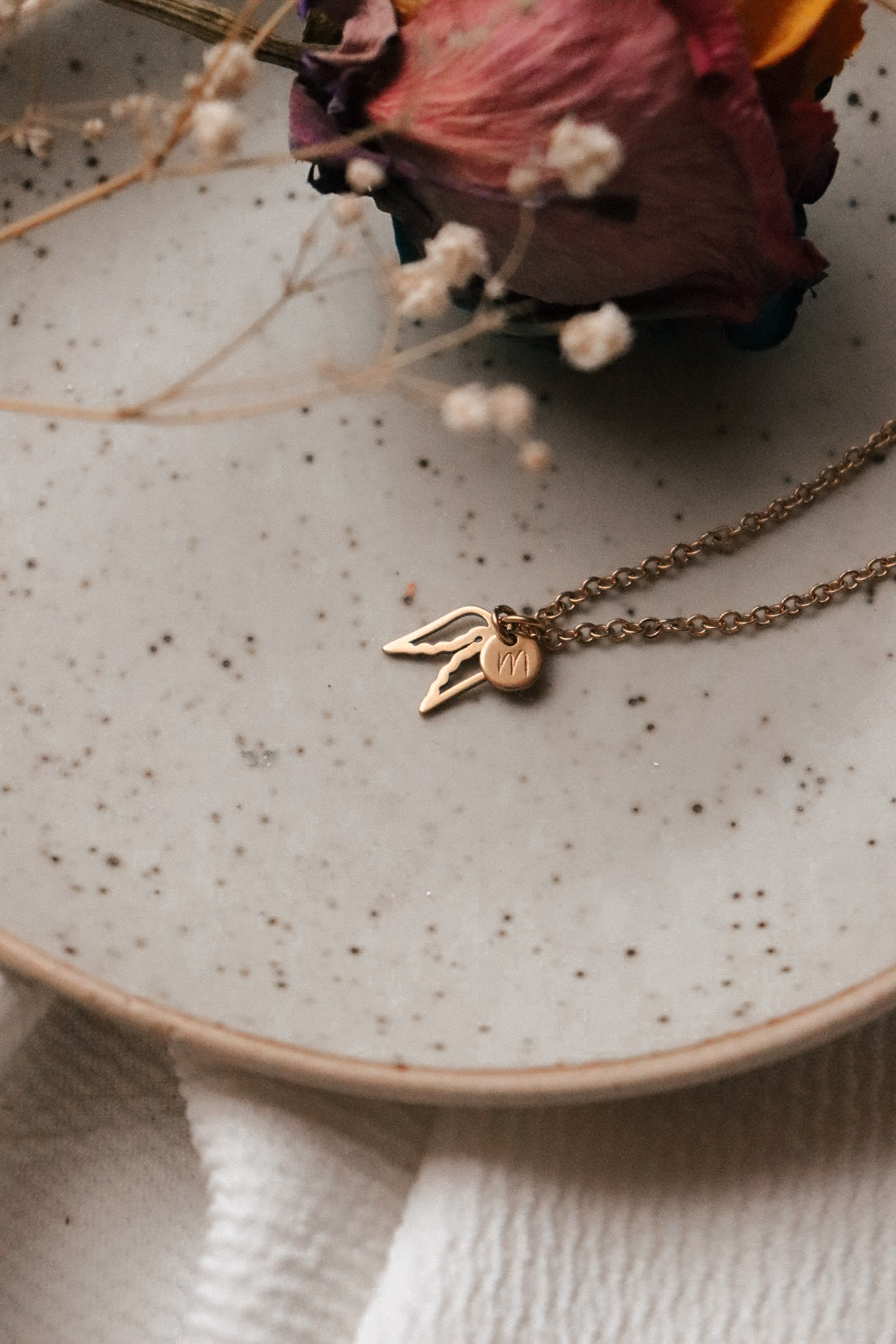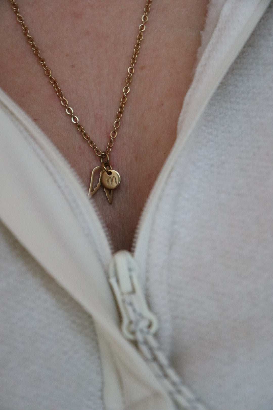 Collier ailes d'ange en l'honneur de toutes ses personnes parties trop tôt. Vous avez aussi la possibilité d'ajouter une petite initiale de la personne. Possibilité aussi d'avoir la chaine COURTE (16-18 pouces) ou plus longue pour le porter près du coeur (22-24 pouces).